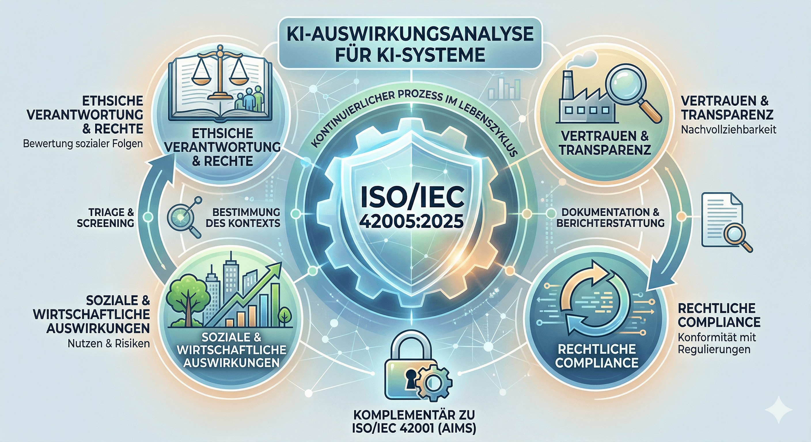 Aber der Standard, über den im deutschsprachigen Raum kaum jemand spricht, ist ISO/IEC 42005. Er wurde 2025 veröffentlicht und beantwortet eine Frage, die ab August 2026 mit dem EU AI Act operativ wird: Wie bewertet ein Unternehmen die Auswirkungen seiner KI-Systeme auf Beschäftigte, Kunden und Geschäftspartner?